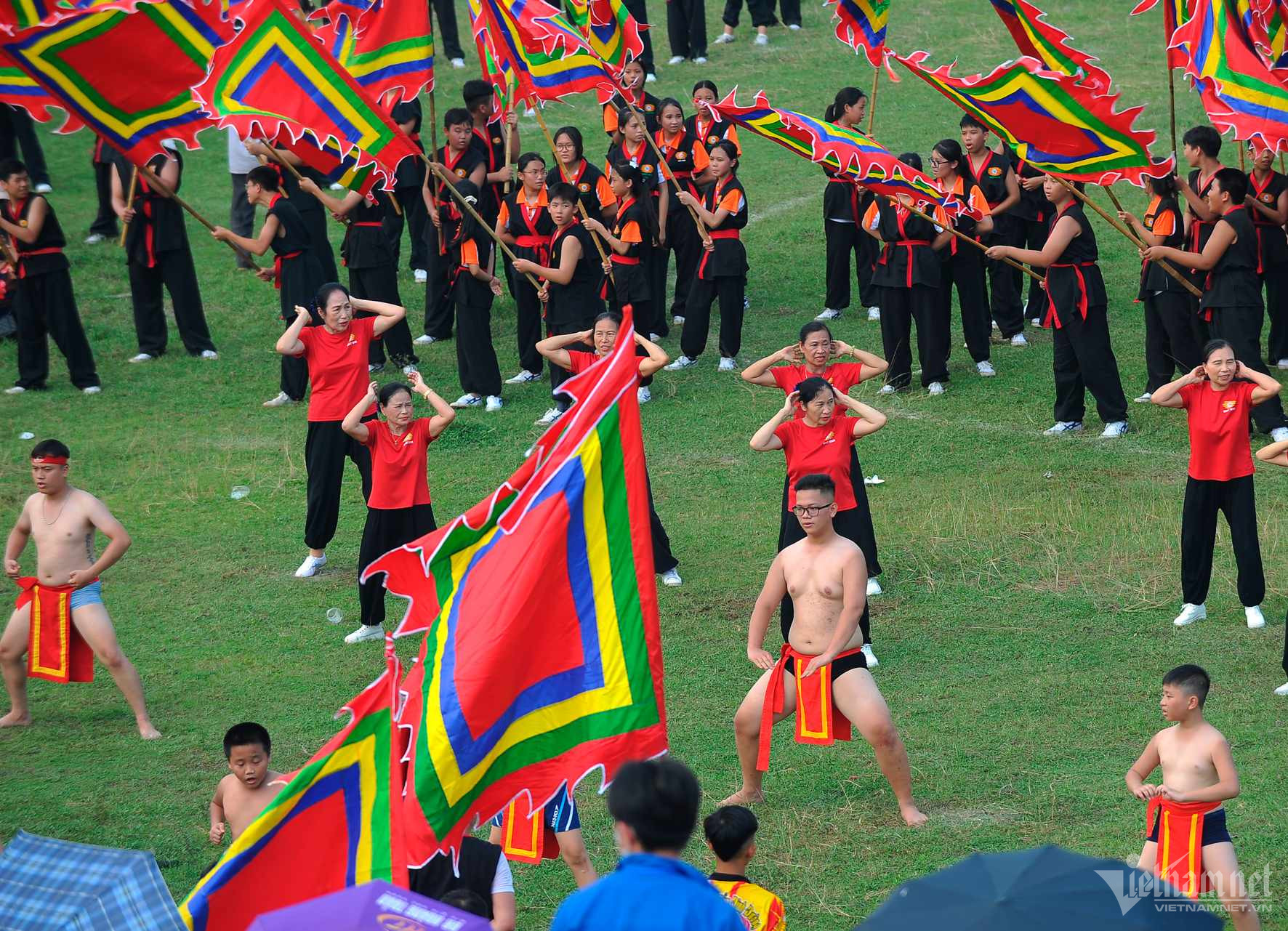 Trên bến, 500 võ sinh thuộc môn phái Võ Nhất Nam, 100 tiêu binh, hàng trăm diễn viên không chuyên và các đội lân sư rồng, trống, chiêng trong trang phục cổ truyền, hừng hực khí thế.