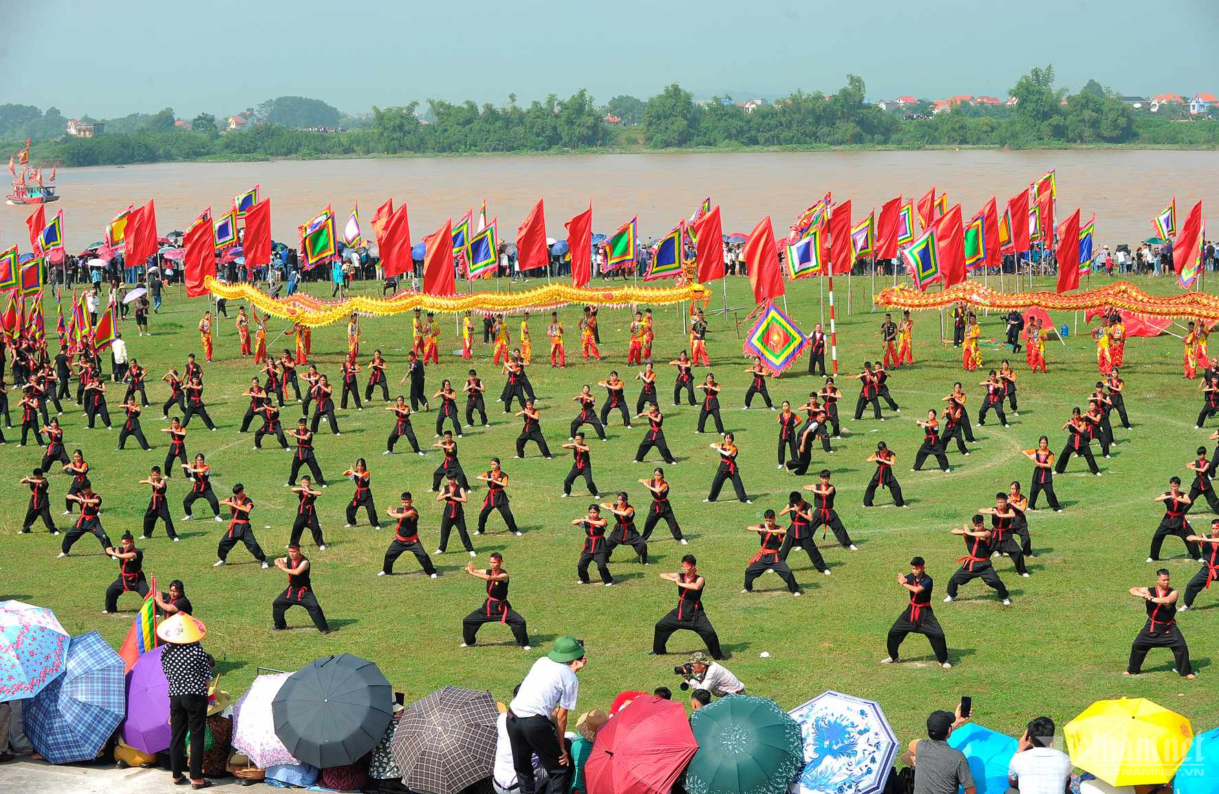 Khi pháo hiệu bắt đầu, tiếng trống, tiếng chiêng nổi lên làm cả vùng Kiếp Bạc rộn vang. Các lực lượng trên bờ, dưới nước phối hợp nhịp nhàng dàn trận, hiệp đồng diễn xướng hội quân theo 3 chủ đề.
