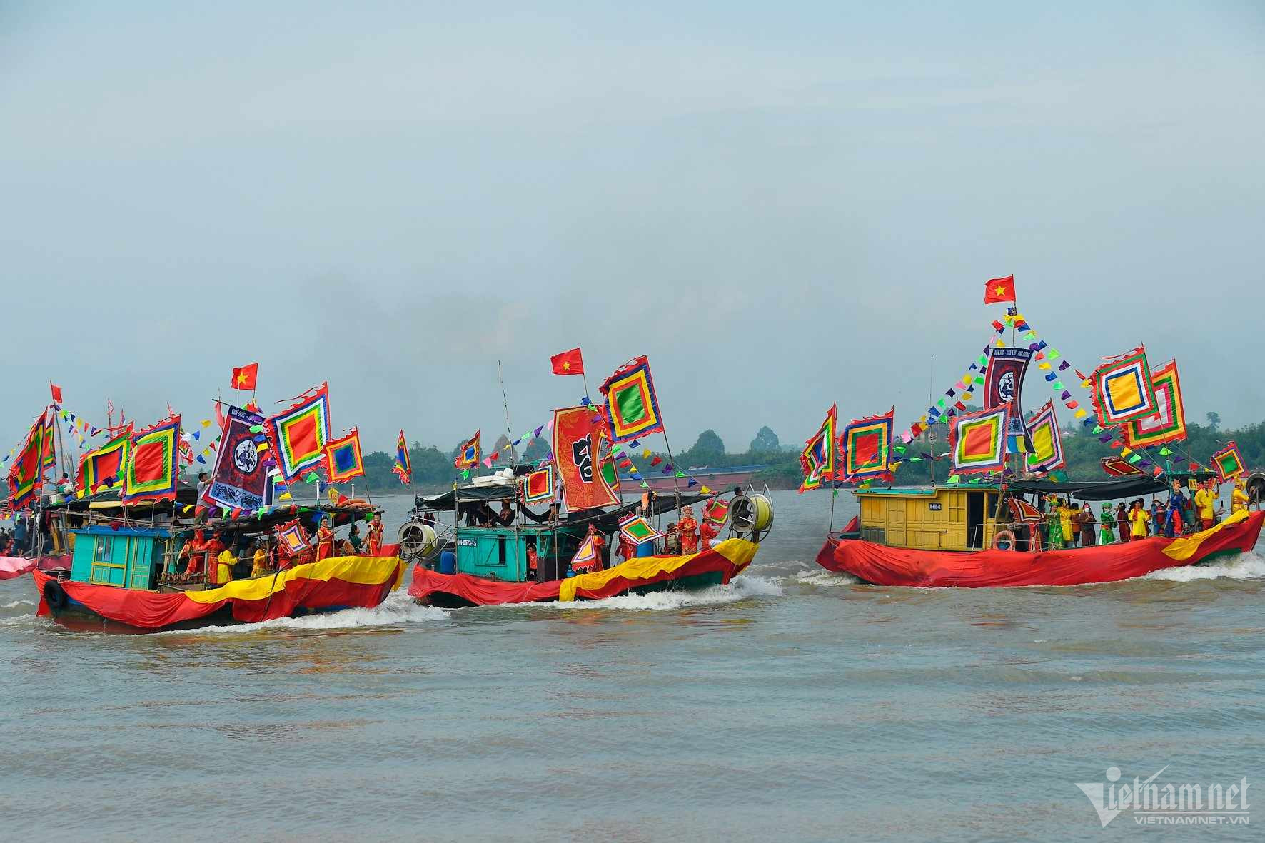 Dưới sông Lục Đầu có 32 chiến thuyền của ngư dân Kênh Giang (Đông Triều, Quảng Ninh) được trang trí lộng lẫy, sẵn sàng đợi hiệu lệnh.