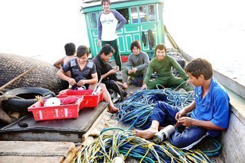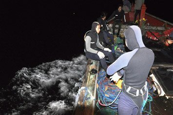Các ngư dân Việt Nam chuẩn bị đồ nghề lặn bắt hải sâm tại ngư trường Hoàng Sa của Việt Nam |