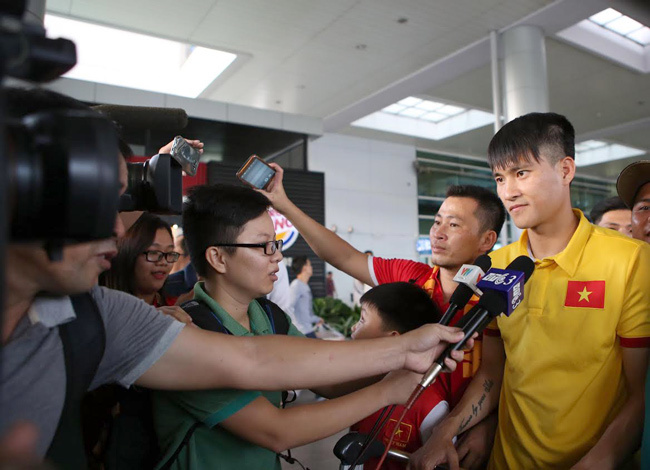 Trở về trên chuyến bay đầu tiên là hầu hết các cầu thủ đá chính ở trận đấu gặp Campuchia, như Công Vinh, Thành Lương, Công Phượng...cùng với HLV Hữu Thắng.