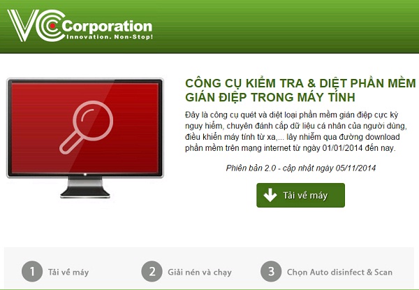 Chính vì thế, nhằm giúp người dùng phát hiện và diệt loại phần mềm gián điệp cực kỳ nguy hiểm, chuyên đánh cắp dữ liệu cá nhân của người dùng, điều khiển máy tính từ xa,... lây nhiễm qua đường download phần mềm trên mạng Internet ở trên, từ ngày 01/01/2014 đến nay. Phía VCCorp đã tung ra công cụ kiểm tra và diệt phần mềm gián điệp trong máy tính người dùng tại địa chỉ: https://antivirus.vccorp.vn/index.html. Đây là phiên bản 2.0 được cập nhật trong ngày 5/11.
