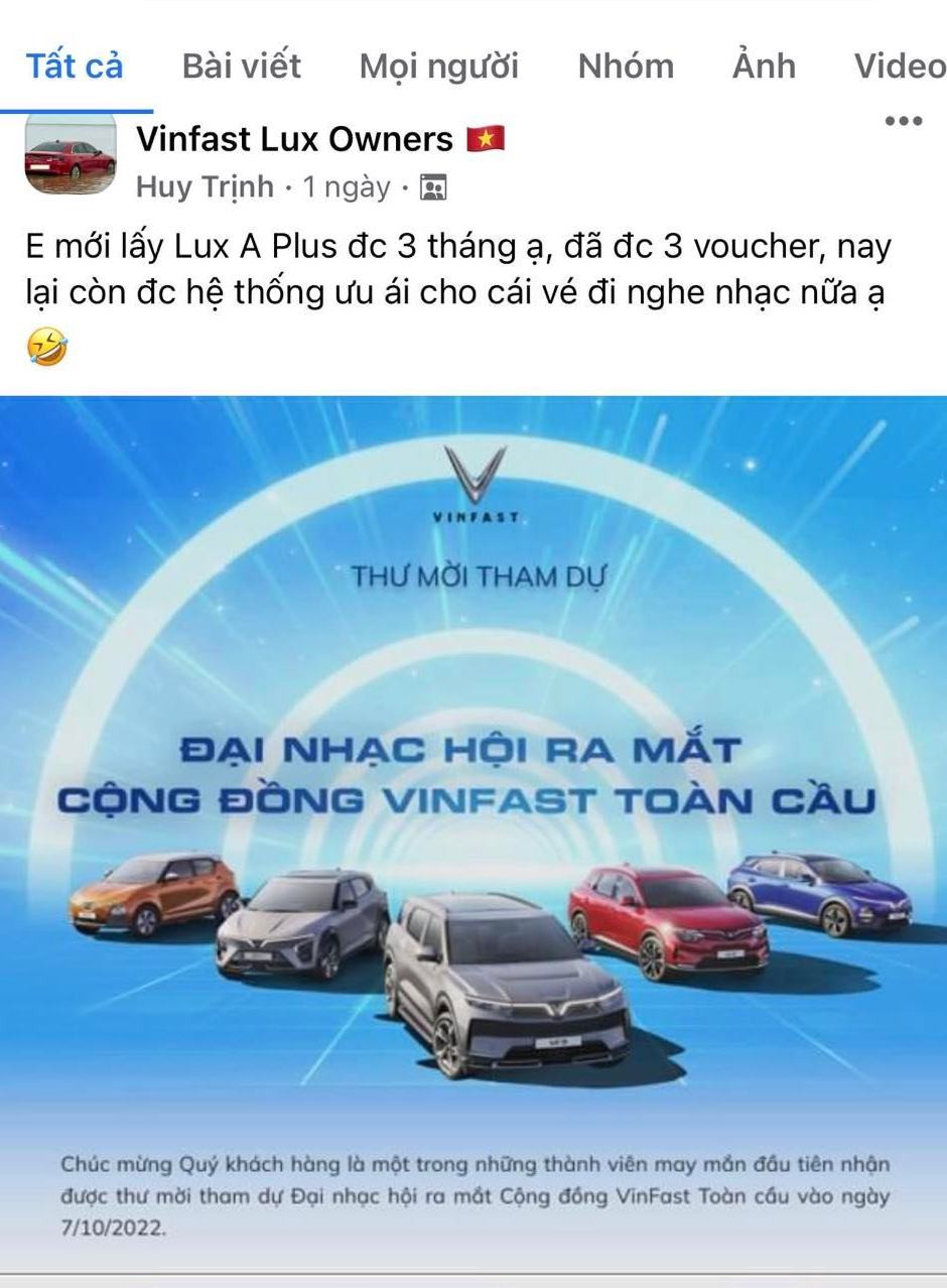 “Em mới lấy Lux A Plus được 3 tháng, đã được 3 voucher, nay lại còn được hệ thống ưu ái cho vé đi nghe nhạc nữa”, thành viên Huy Trịnh chia sẻ trên một diễn đàn uy tín của các chủ xe VinFast.
