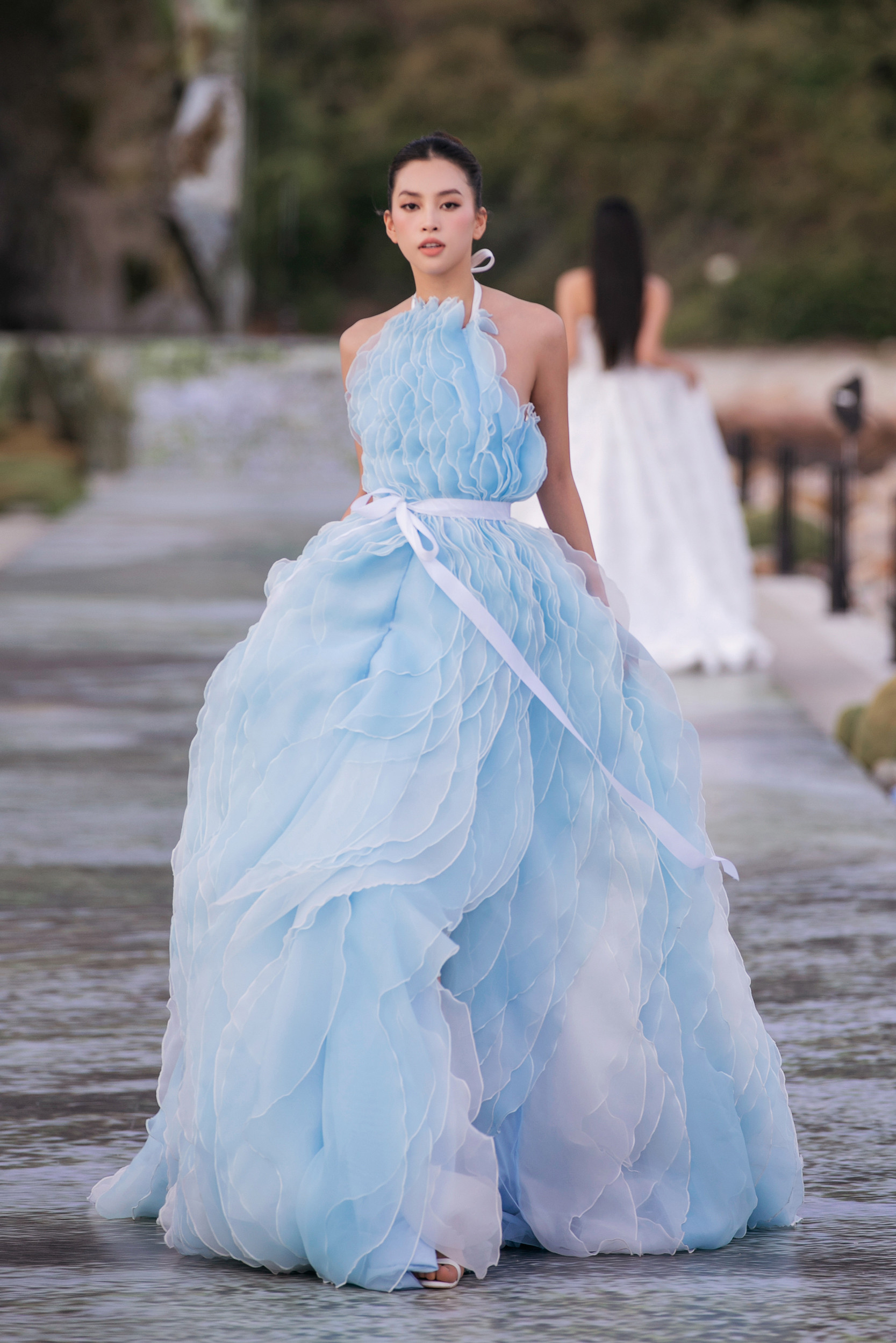 Đảm nhận vai trò vedette trong bộ sưu tập của Hà Thanh Việt, hoa hậu Tiểu Vy diện bộ váy tông màu xanh pastel ngọt ngào.