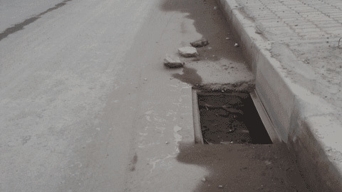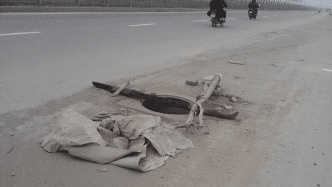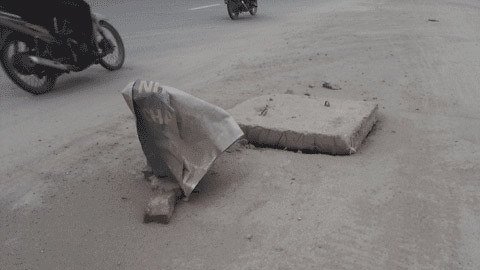 | Nắp cống này bị trộm lấy từ lâu, nhưng nó chưa được thay thế nên người dân đã lấy cây khô và nilon để cảnh báo nguy hiểm cho người đi đường. Và ngay bên trên, cũng là một nắp cống bị trộm được “đắp kín” bằng một tấm bê tông thiếu thẩm mỹ, lại rất nguy hiểm cho người đi đường |