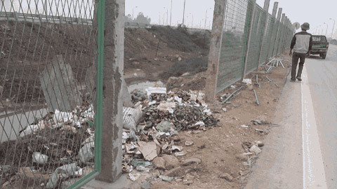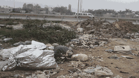 | Đại lộ Thăng Long trở thành nơi cánh tài xế đổ trộm phế thải. Trong ảnh là những đống đất phế thải được đổ đã lâu nhưng không có người thu dọn. |