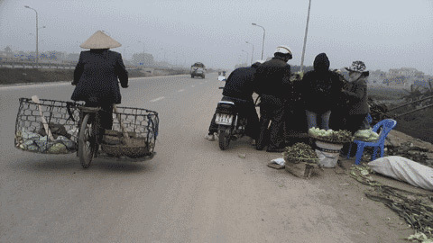 | Chợ bán ngô vẫn hoạt động cả ngày trên cầu vượt Sông Đáy. Vào giờ cao điểm, người bán ngô đánh xe ra tận giữa đường để mời chào khách. |