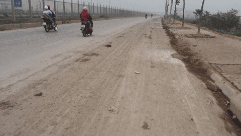 | Đất đá và cát sỏi “lấn chiếm” lòng đường, trải dài trên đại lộ như một minh chứng con đường như không có người quản lý, quét dọn từ cả tháng nay. |