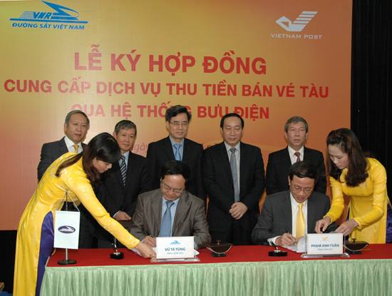Hợp đồng cung cấp dịch vụ thu hộ tiền vé tàu điện tử qua hệ thống Bưu điện giữa Tổng Công ty Đường sắt Việt Nam (VNR) và Tổng Công ty Bưu điện Việt Nam (VietnamPost) vừa được chính thức ký kết hôm nay (12/11/2014). Lễ ký có sự tham dự của Thứ trưởng Bộ TT&TT Nguyễn Thành Hưng và Thứ trưởng Bộ Giao thông Vận tải Nguyễn Hồng Trường.