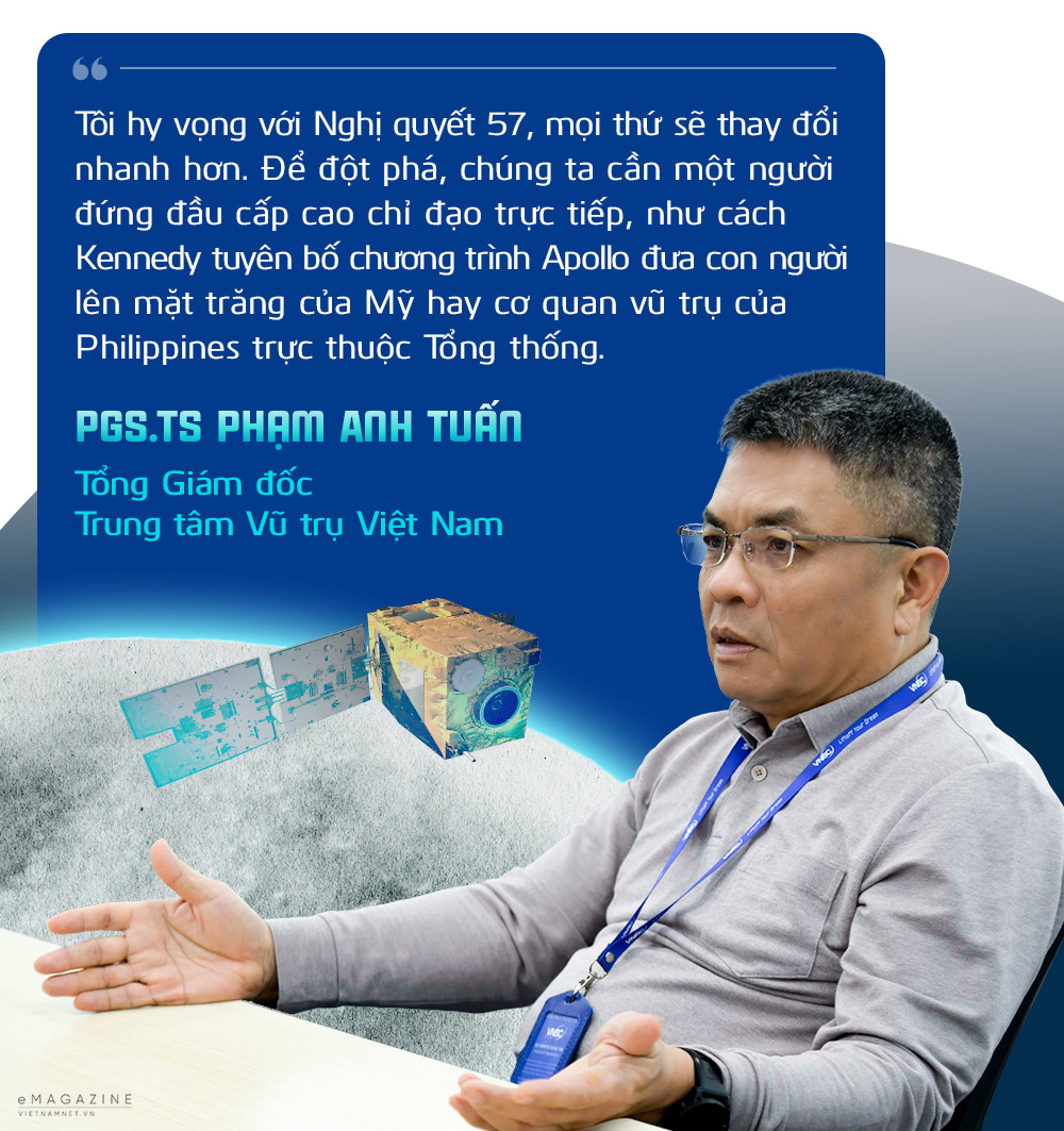 “Tôi làm chiến lược vũ trụ từ năm 2006, đến nay gần 20 năm. Tôi hy vọng với Nghị quyết 57, mọi thứ sẽ thay đổi nhanh hơn. Để đột phá, chúng ta cần một người đứng đầu cấp cao chỉ đạo trực tiếp, như cách Kennedy tuyên bố chương trình Apollo đưa con người lên mặt trăng của Mỹ hay cơ quan vũ trụ của Philippines trực thuộc Tổng thống”, Tổng giám đốc Trung tâm Vũ trụ Việt Nam nhấn mạnh.