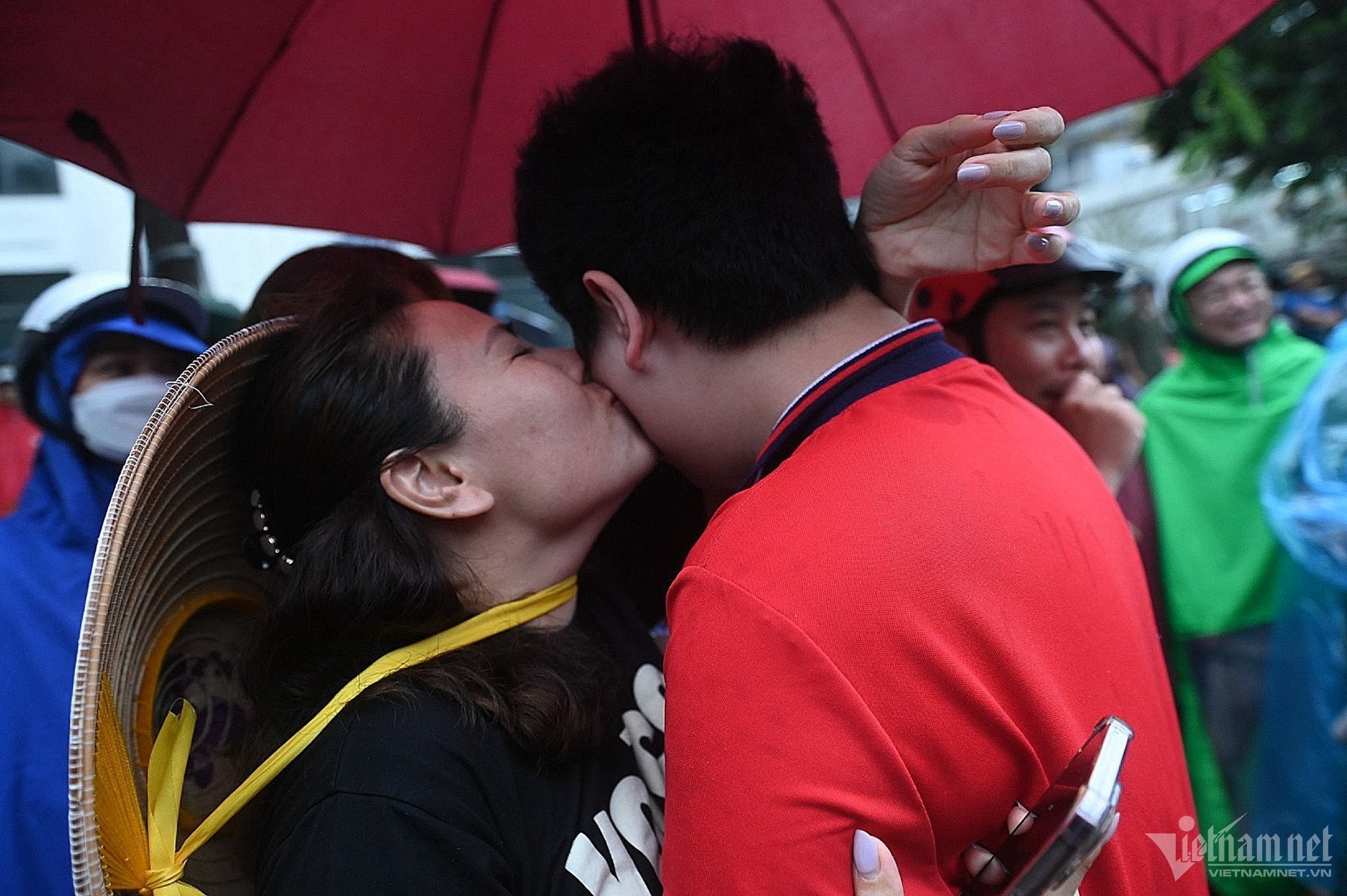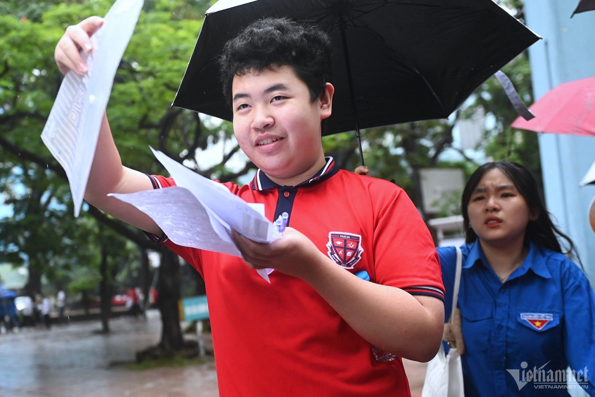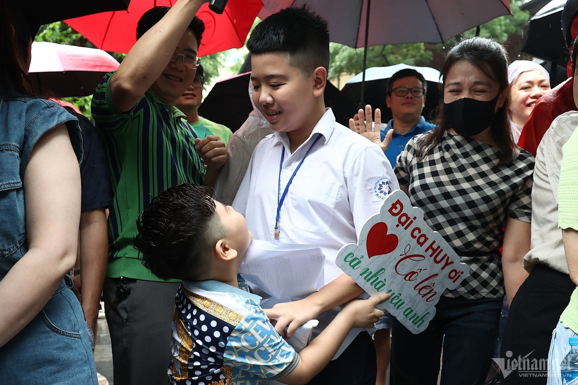 Cả gia đình đi từ quận Hoàng Mai, đứng chờ thí sinh Trương Công Gia Huy (lớp 9A4, Trường THCS Hoàng Mai) tại điểm thi THPT Trần Phú trong mưa. Em trai của sĩ tử sung sướng ôm lấy anh trong tiếng reo hò của những người xung quanh.
