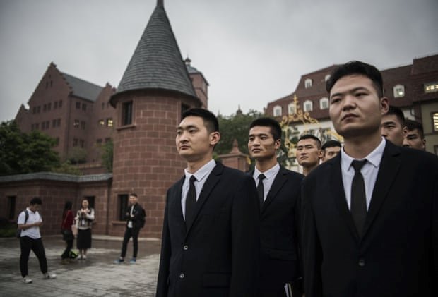Các nhân viên an ninh của Huawei xếp hàng vào cuối ngày làm việc |