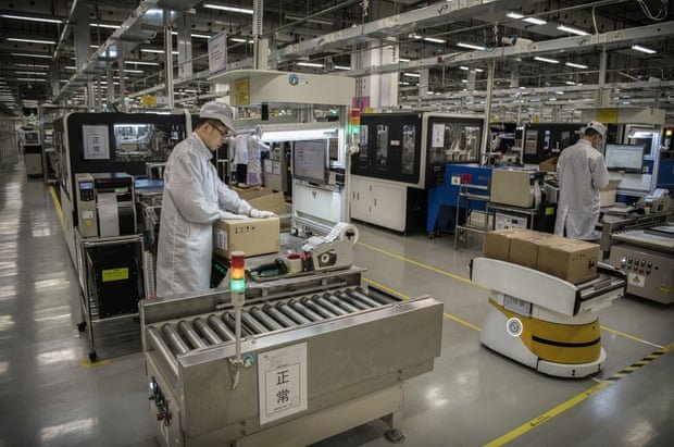 Các nhân viên đang đóng gói một thiết bị smartphone mới tại dây chuyên sản xuất ở nhà máy |