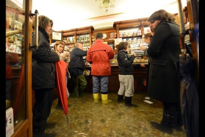 Nước ngập quá đầu gối khiến các du khách và người dân gặp phải nhiều bất tiện khi đi lại. Những chiếc thuyền gondola nằm im ở bến, thay vào đó là các con thuyền cứu hộ.