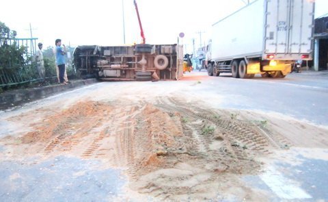 | Chiếc xe tải bị nạn và vệt cát trên đường |