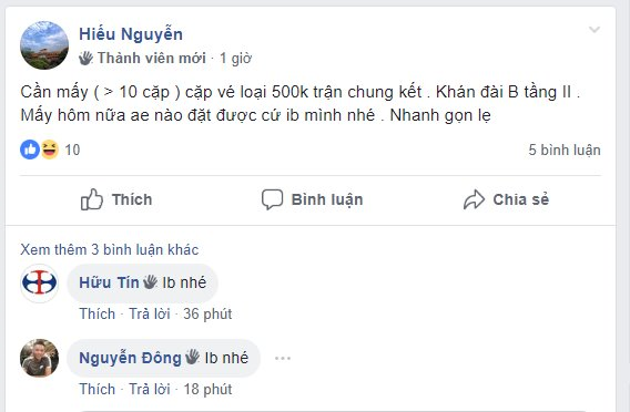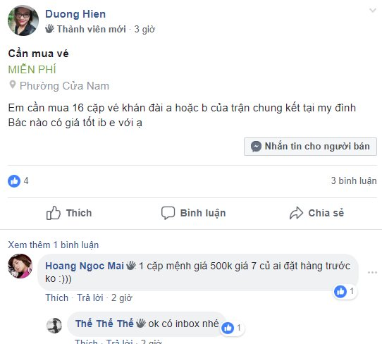 Cũng không ít người đã rao cần mua vé vào sân, số lượng khá lớn từ 10-15 vé. Có người rao cặp vé VIP giá 10 triệu đồng, vé vào khán đài A giá 7-8 triệu đồng. Những người nhận đặt trước vé vào sân đều cho biết sẽ nhận vé sau ngày 11/12.