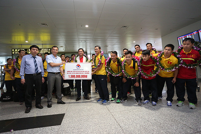 Có mặt tại sân bay Nội Bài (Hà Nội) sáng nay, Phó Chủ tịch VFF Trần Quốc Tuấn đã trực tiếp trao thưởng 1,5 tỷ đồng cho đội tuyển futsal Việt Nam. Ông Tuấn nhấn mạnh đây là mức thưởng rất xứng đáng sau những gì đã làm được tại World Cup Futsal châu Á.