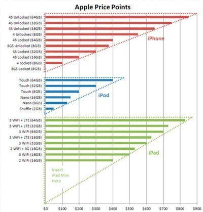 Chuyên gia Ryan Jones cũng đã chứng minh cho luận điểm của mình bằng biểu đồ mức giá tương ứng cho mỗi sản phẩm iPhone, iPod và iPad để mọi người nhận thấy rằng khoảng trống hình tam giác ở phía dưới của thị trường máy tính bảng chính là tử huyệt của Apple. Để tiếp tục giữ vững vị thế thống trị của mình, không còn cách nào khác là Apple phải có iPad mini và câu hỏi còn lại là “Bao giờ thì iPad mini ra mắt?”.