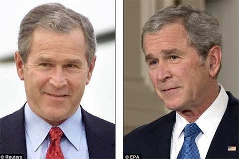 George W Bush từ 2001 tới 2009: Khuôn mặt trẻ thơ của Tổng thống đã trở nên già dặn hơn nhiều khi ông nắm quyền.