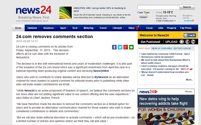 Ban lãnh đạo News24 đã từng rất băn khoăn về chính sách kiểm soát bình luận của họ. "Chúng tôi lo ngại về vấn đề trách nhiệm pháp lý và ảnh hưởng danh tiếng nếu tiếp tục sử dụng chính sách bình luận trước đây," nhà báo Andrew Trench ở News24 chia sẻ. Cuối cùng tờ báo này đã quyết định loại bỏ hoàn toàn phần bình luận dưới bài viết.
