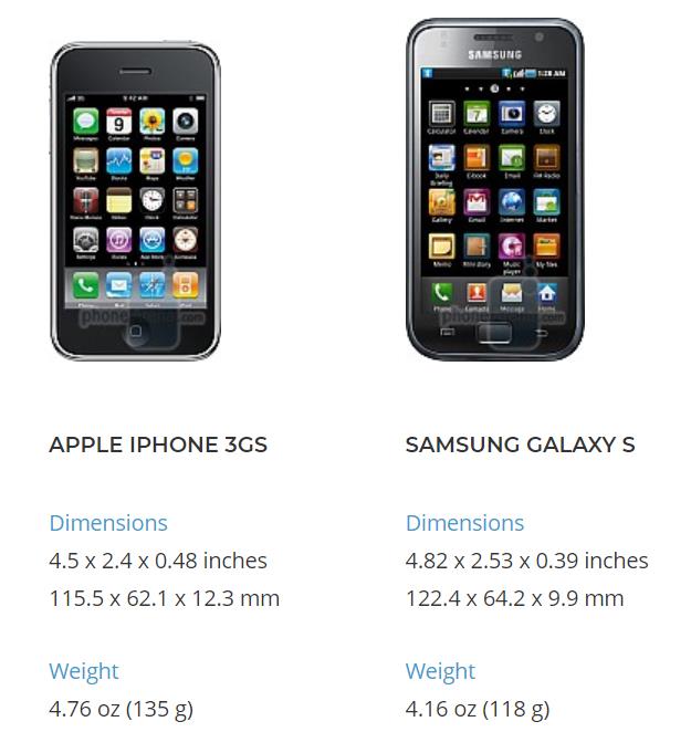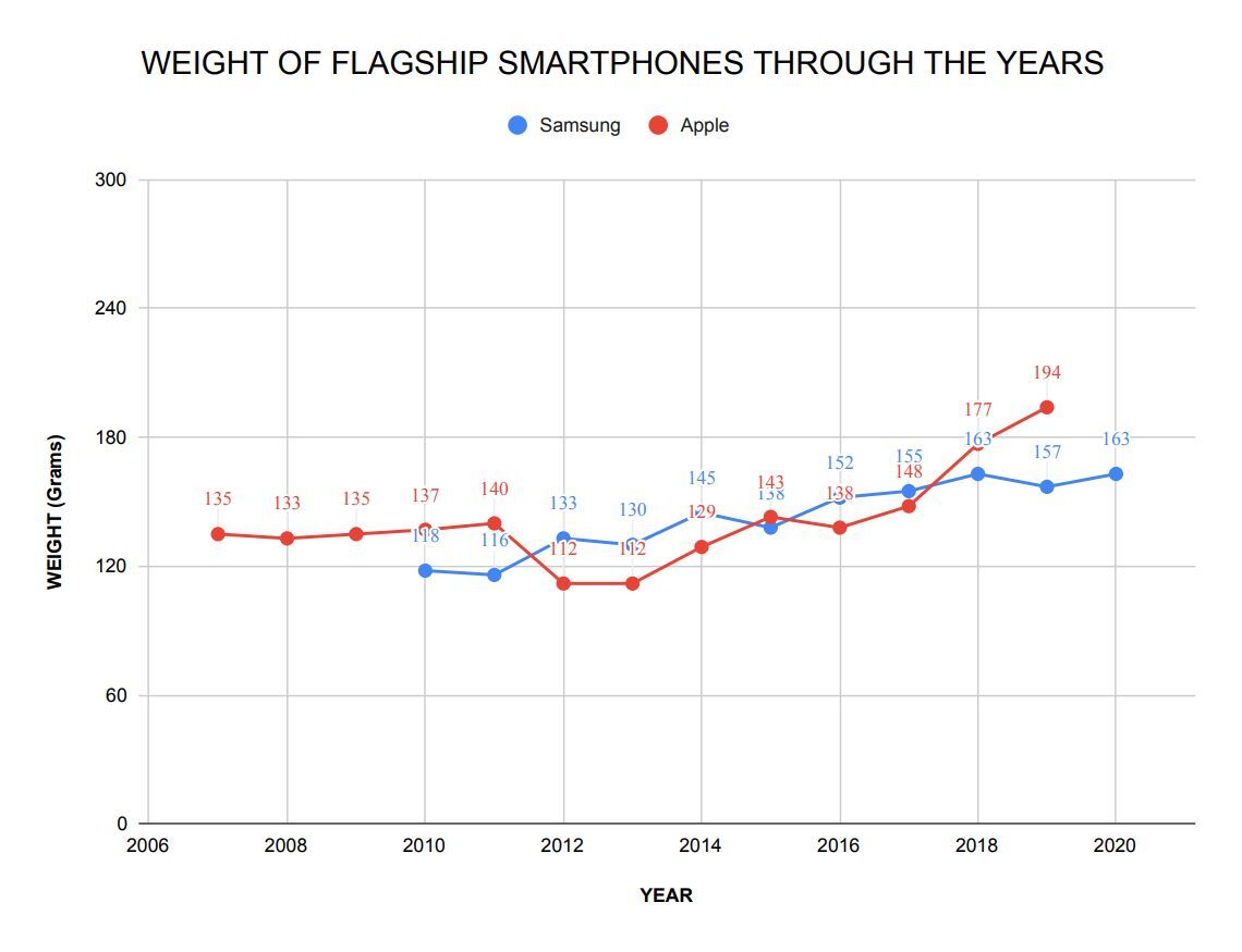 Một vài mẫu iPhone đầu tiên gần như giữ nguyên trọng lượng, trong khoảng từ 133 đến 140 gram. Thực sự thú vị khi xem xét iPhone 4, với thiết kế táo bạo và độc đáo, kết hợp kim loại và kính song trọng lượng không tăng nhiều. Trong khi đó, những mẫu máy Galaxy S đầu tiên của Samsung khá nhẹ nhàng khi ra mắt vào năm 2010. Nếu so sánh iPhone 3GS với Samsung Galaxy S (chúng rất giống nhau, vì thế đã có nhiều vụ kiện tụng), sẽ thấy rằng Galaxy S nhẹ hơn gần 30 gram, dù có màn hình lớn hơn và nói chung là một thiết bị lớn hơn.