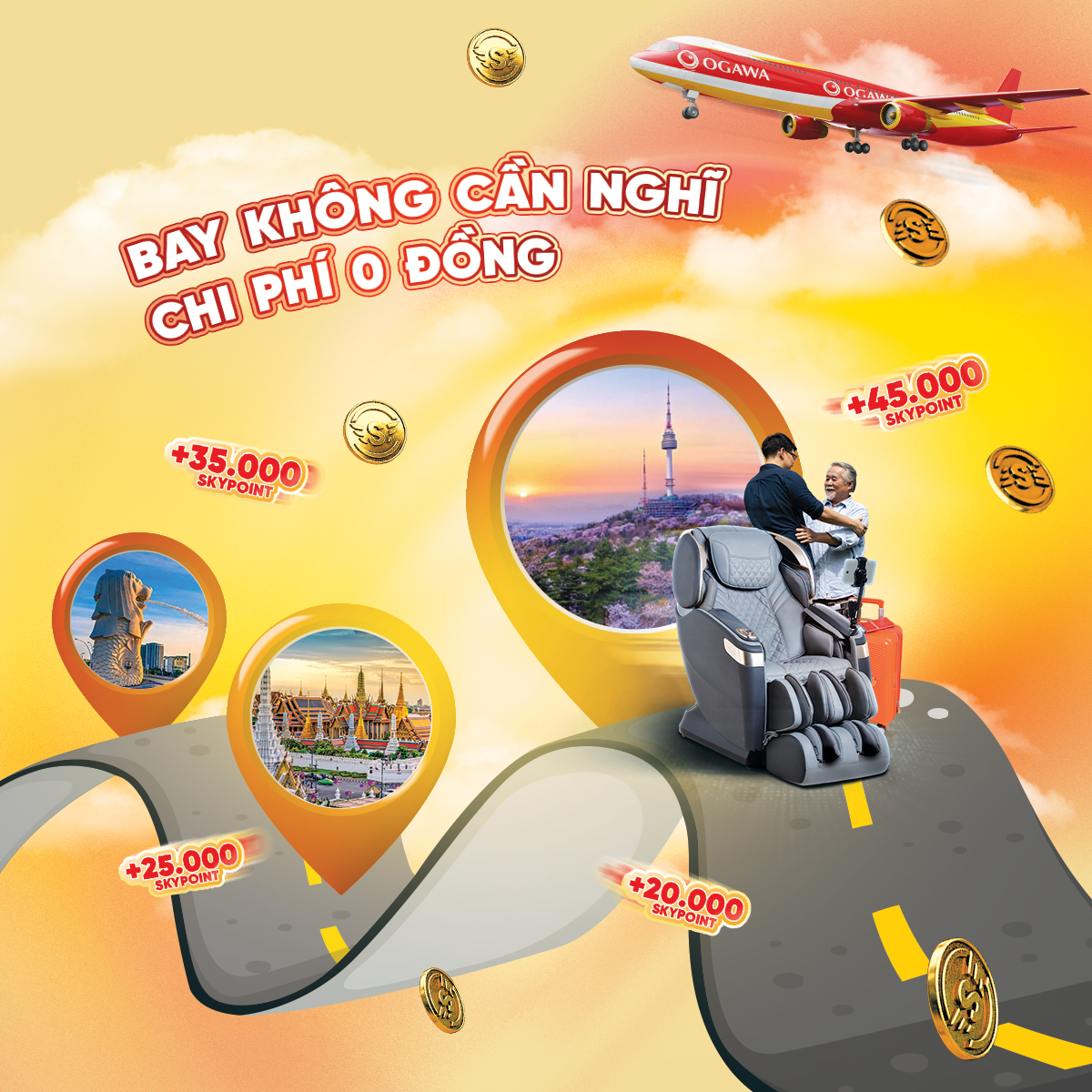 Đây là chương trình ưu đãi đặc quyền mua sắm mà Ogawa đem đến cho khách hàng duy nhất trong tháng 6 này. Cụ thể, khi mua ghế massage Ogawa, các khách hàng sẽ được nhận điểm SkyPoint tối đa lên đến 45.000 điểm trên ứng dụng SkyJoy. Khách hàng có thể dễ dàng đổi điểm thưởng từ Ogawa Vietnam thành vé máy bay của VietJet với mức chi phí 0 đồng.