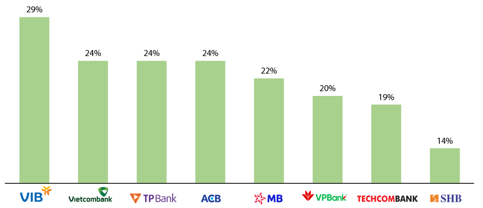 ROE trung bình của Top 8 đạt 22% cao hơn mức trung bình ngành là 17%. Trong đó, VIB dẫn đầu toàn ngành với ROE trung bình giai đoạn 2019 - 2021 là 29%. Có thể thấy, các nhà băng không ngừng đầu tư mạnh mẽ vào con người, công nghệ và nền tảng vận hành, như Vietcombank và VIB rất tích cực trong việc đẩy mạnh các nền tảng số hóa, xây dựng mô hình vận hành hiệu quả và ngày càng quy chuẩn bộ sản phẩm dịch vụ sáng tạo phục vụ khách hàng.