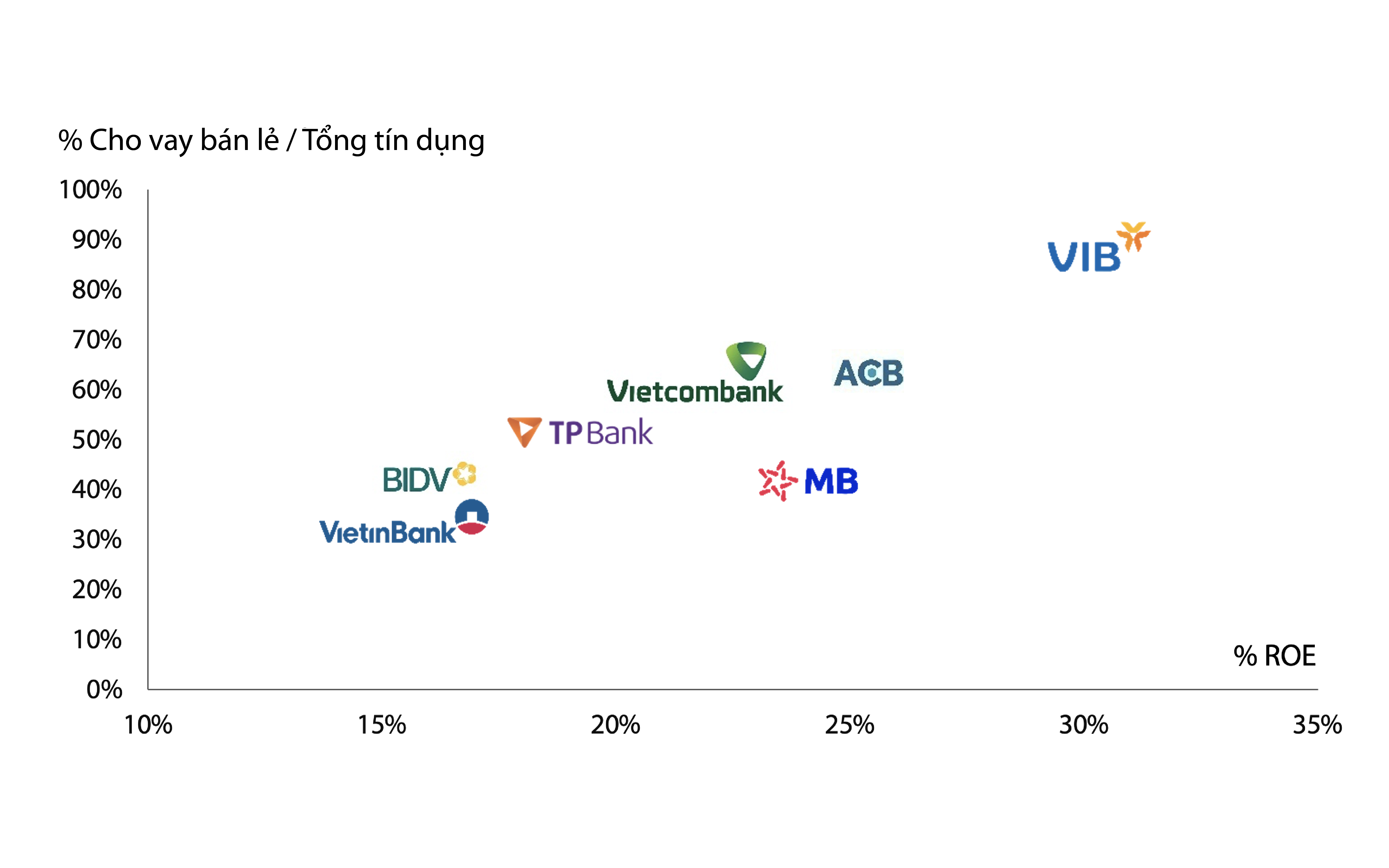 Biểu đồ: Tỷ trọng bán lẻ trên tổng dư nợ và ROE của các ngân hàng năm 2022