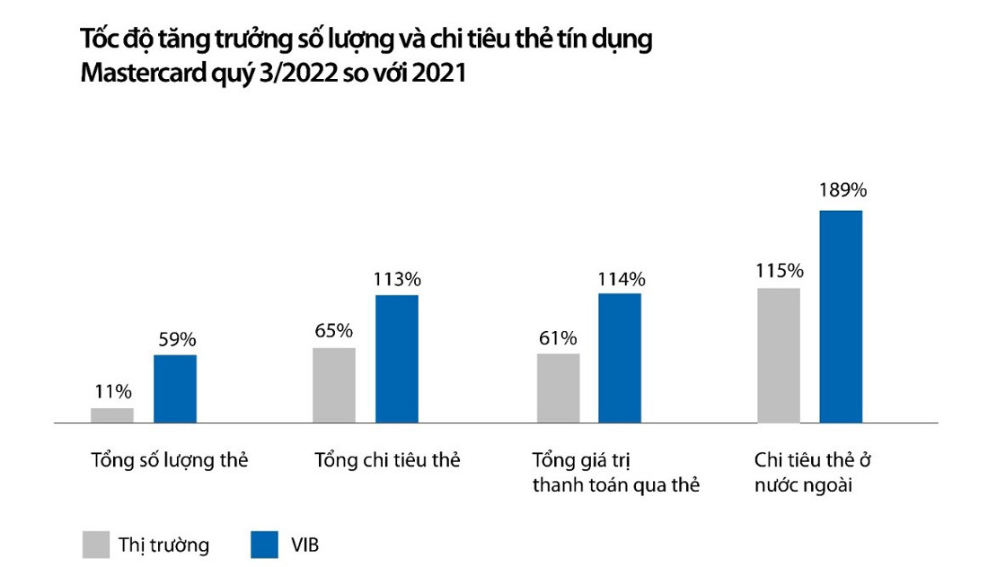 Con số chi tiêu của người Việt qua thẻ tín dụng VIB tăng trưởng 8,6 lần, từ 8.400 tỷ đồng/năm (360 triệu USD) vào năm 2018, lên 75.000 tỷ đồng/năm (hơn 3 tỷ USD) năm 2022. Theo Mastercard, VIB chiếm hơn 33% tổng chi tiêu thẻ Mastercard tại Việt Nam và dẫn đầu về tốc độ tăng trưởng, gấp 5 - 6 lần trung bình của Mastercard trên tất cả tiêu chí số lượng và chất lượng.