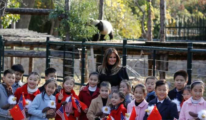 Phu nhân của Tổng thống Mỹ đã được một nhóm học sinh vẫy cờ Trung Quốc và Mỹ đón chào, dẫn bà tới chuồng gấu trúc. Giám đốc vườn thú Li Xiaoguang nói với các phóng viên, bà Trump có "tiếp xúc kín" với gấu trúc Gu Gu.