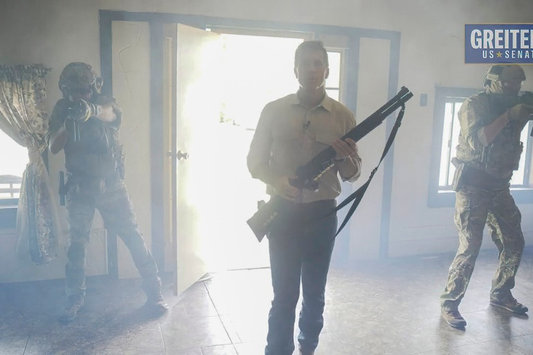 Đội chiến thuật vũ trang sau đó đột nhập cửa trước và ném lựu đạn nổ vào bên trong. Greitens bước vào một phòng qua làn khói và nói, “Hãy tham gia phi hành đoàn MAGA. Nhận giấy phép săn RINO vô hạn cho đến khi chúng ta cứu được đất nước của mình ”.