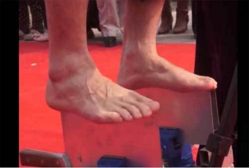 Sau đó, đầu bếp đặt chân trần lên hai lưỡi dao sắc và tiếp đó cắt thịt trên một quả bóng. Miếng thịt được cắt nhỏ trong khi quả bóng vẫn nguyên vẹn.