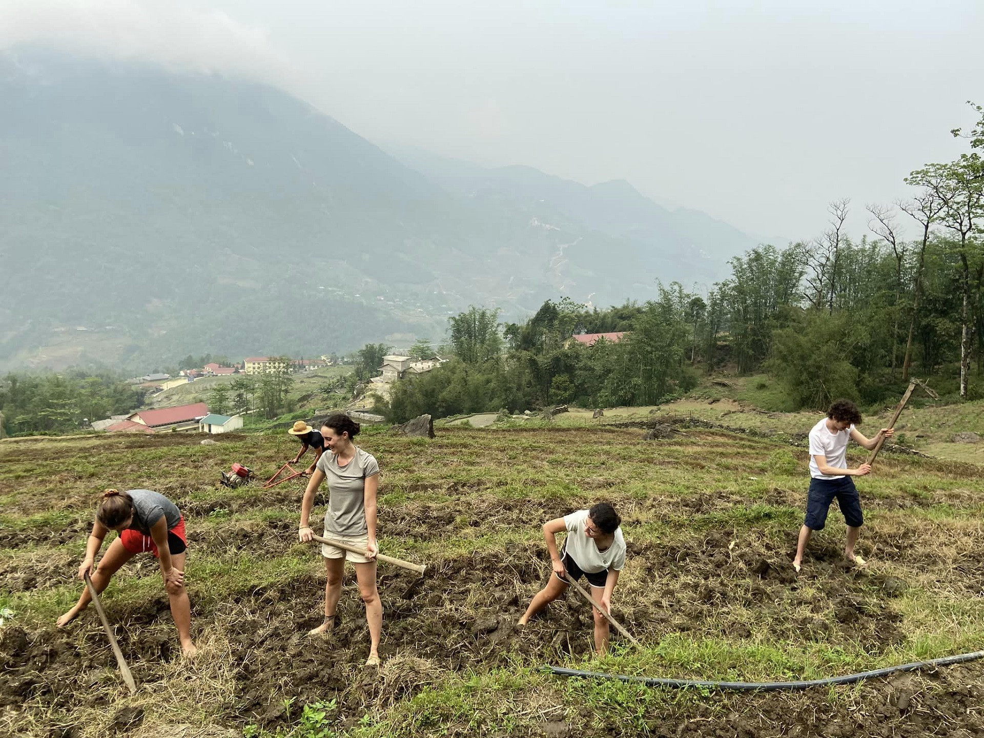 "Các bạn du khách tới homestay của vợ chồng mình và mình trực tiếp dẫn tour. Ngoài trải nghiệm trekking, chiều qua mình mời các bạn tới khu ruộng của gia đình ở thung lũng Mường Hoa, thử cấy lúa như đồng bào Mông. Các bạn khách còn khá trẻ nên rất thích thú với hoạt động này. Tuy lấm lem bùn và rất mệt sau hơn một giờ cấy lúa nhưng ai cũng vui, thích thú", anh Sấu kể.