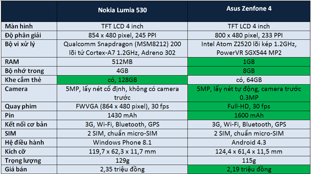 Về cấu hình, hai máy cùng có màn hình 4 inch, hỗ trợ 2 SIM và các kết nối cơ bản như nhau nhưng khác biệt về nền tảng hệ điều hành. Ở các thông số còn lại, Asus Zenfone 4 có nhiều chi tiết nhỉnh hơn như dung lượng bộ nhớ RAM, bộ nhớ trong, camera, pin và giá bán rẻ hơn.