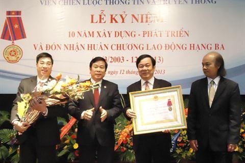 | Bộ trưởng Nguyễn Bắc Son trao Huân chương Lao động hạng Ba cho lãnh đạo Viện Chiến lược TT&TT. (Ảnh: Ảnh: X.B. - ICTnews.) |