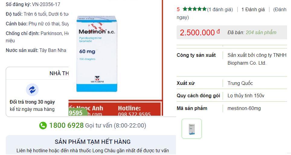 Tối 22/10, tra cứu trên hệ thống một số nhà thuốc lớn như L.C, A.K, Ph.C kết quả đều cho thấy thuốc Mestinon 60mg lọ 150 viên đã cạn hàng. Một nhà thuốc tên N.A hiển thị có sẵn 300 lọ và giá 2.500.000 đồng/lọ.