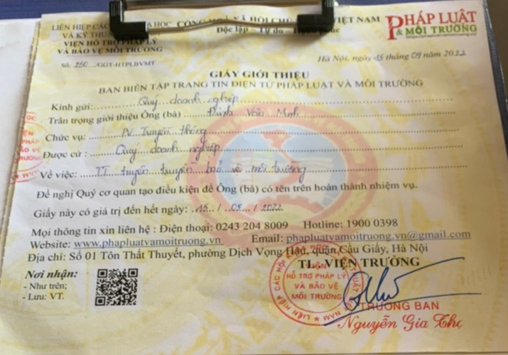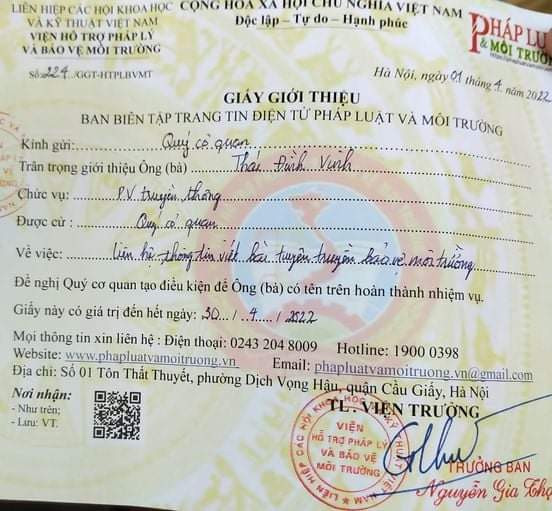 Ông Lê Văn Nam, Phó giám đốc Sở TT&TT Thanh Hóa cho biết, qua công tác theo dõi báo chí trên địa bàn tỉnh, Sở đã nhận được nhiều thông tin về việc Viện hỗ trợ Pháp lý và Bảo vệ môi trường cấp giấy giới thiệu cho ông Thái Đình Vinh và Đinh Văn Minh với nội dung “liên hệ thông tin viết bài tuyên truyền về bảo vệ môi trường” đăng trên Trang tin điện tử của Viện.