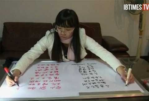 Cô gái này khiến người xem phải giật mình sửng sốt với khả năng không chỉ viết bằng hai tay cùng lúc mà còn viết hai tay hai ngôn ngữ khác nhau: một bằng tiếng Anh và một bằng tiếng Trung Quốc.