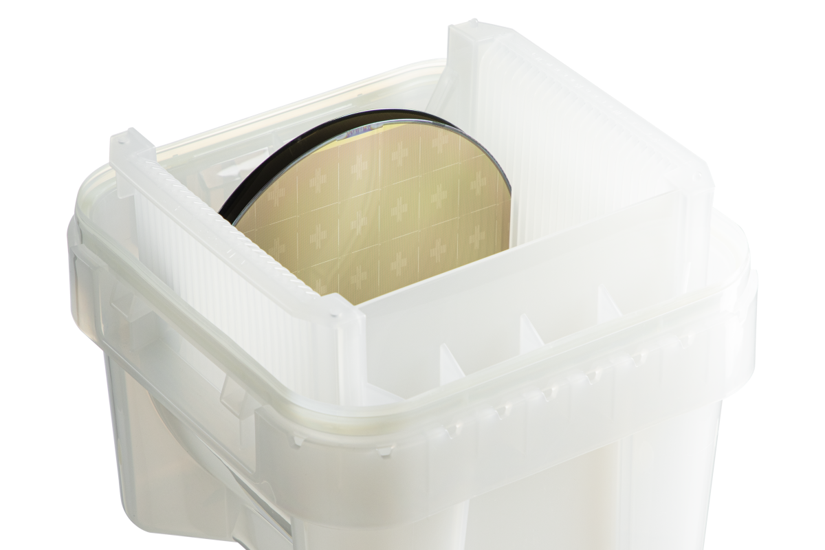 Tấm wafer chip vi mạch đặt trong hộp đóng gói.