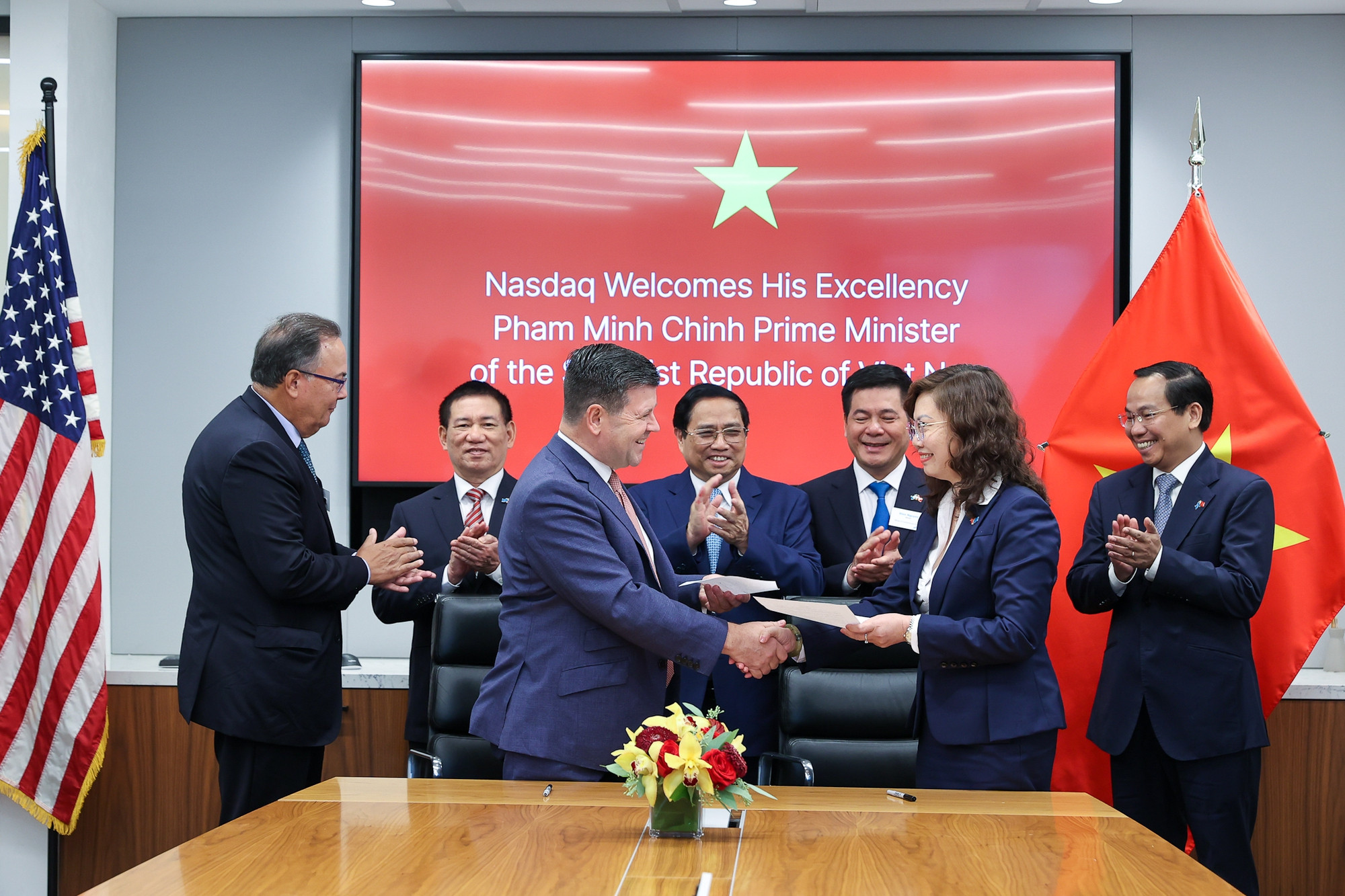 Ngày 22/9 (giờ địa phương), sau khi bấm nút rung chuông khai mạc phiên chứng khoán đầu tiên tại sàn giao dịch chứng khoán NASDAQ, New York, Thủ tướng Phạm Minh Chính tham dự tọa đàm bàn tròn với một số doanh nghiệp.