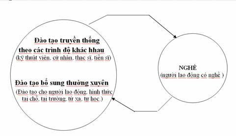 Trên hình 2, mũi tên từ trái sang phải có nghĩa là sau khi đào tạo truyền thống theo các trình độ khác nhau : Kỹ thuật viên, cử nhân, thạc sĩ, tiến sĩ...người học mới có nghề để đi làm. Mũi tên từ phải sang trái có nghĩa là người lao động đã có nghề nghiệp ổn định vẫn được thường xuyên được đào tạo bổ sung .