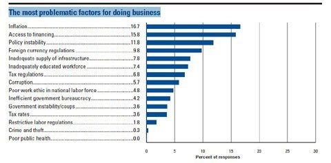 Dù trong năm 2011 chính phủ đã đưa ra nhiều biện pháp để kiềm chế lạm phát, tình hình lạm phát của nước ta vẫn hết sức phức tạp. Theo thống kê của WEF, có 16,7% số người được hỏi cho rằng lạm phát đang là vấn đề nan giải nhất của nền kinh tế, chiếm vị trí số một. Tiếp theo là khả năng tiếp cận các nguồn tài chính (15,8%), chính sách thiếu tính ổn định (11,8%),…