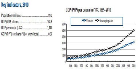 Tuy nhiên, dù mức thu nhập đã được cải thiện đáng kể, đưa Việt Nam gần trở thành quốc gia có mức thu nhập trung bình, thì thống kê của WEF trong vòng 25 năm qua lại cho thấy thu nhập của người dân Việt Nam so với mức trung bình của các quốc gia đang phát triển ở châu Á ngày một thấp hơn. Năm 1985, thu nhập của người lao động Việt Nam gần như tương đương với mức trung bình của các quốc gia đang phát triển khác tại châu Á. Nhưng đến năm 2010, thu nhập bình quân đầu ngươì ở Việt Nam đã thấp hơn mức trung bình này gần 2000 USD.