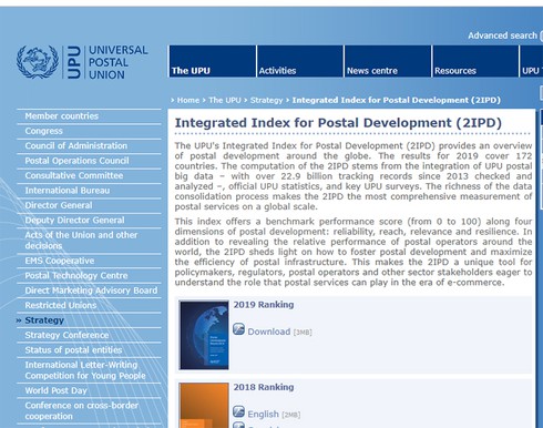 | Bảng xếp hạng Chỉ số tích hợp phát triển bưu chính (2IPD) 2019 được đăng tải công khai trên website của UPU. |