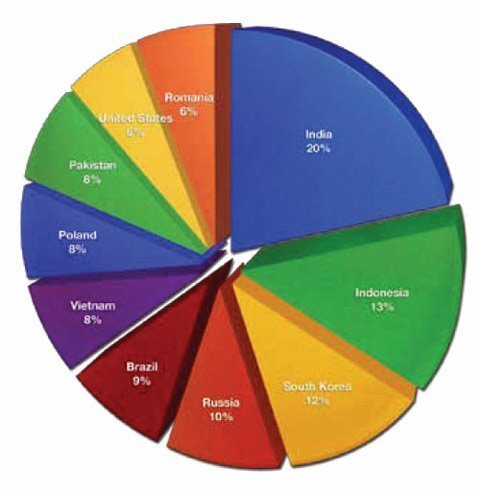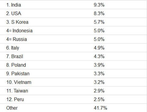 Dưới đây là danh sách top 10 quốc gia phát tán thư rác nhất thế giới của Sophos và Trend Micro.
