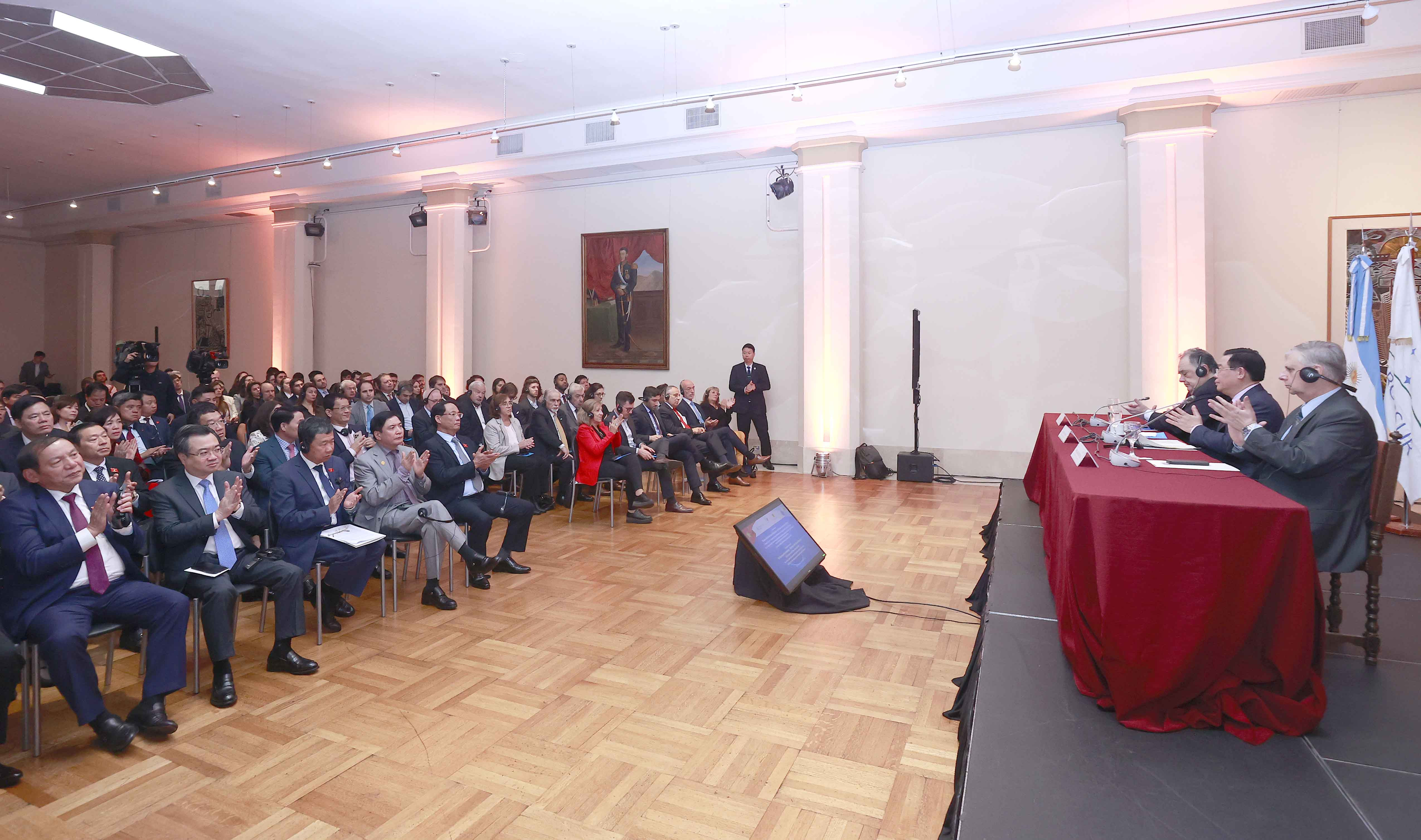 Chúng tôi tiếp tục khẳng định rằng, Việt Nam hết sức coi trọng và mong muốn đẩy mạnh hợp tác cùng có lợi với khu vực Mỹ Latinh. Hiện nay, chúng tôi đã có quan hệ ngoại giao với tất cả 33 nước trong khu vực, trong đó có các bạn bè truyền thống, gắn bó lâu đời, cả về lịch sử, tình cảm và chia sẻ nhiều điểm tương đồng về truyền thống, văn hóa và lợi ích chung. Chủ tịch Hồ Chí Minh kính yêu của Việt Nam trên hành trình bôn ba tìm đường cứu nước đầu thế kỷ XX, Người đã dừng chân tại Argentina và Uruguay. Ở bất kỳ thời kỳ nào, dù trong thời kỳ đấu tranh giành độc lập, thống nhất đất nước và hiện nay, chúng tôi luôn vinh dự nhận được tình đoàn kết chặt chẽ, sự giúp đỡ to lớn và toàn diện của nhân dân thế giới, trong đó có nhân dân Argentina và những người bạn Mỹ Latinh thủy chung, son sắt đã dành cho Việt Nam nghĩa bè bạn thiêng liêng và sự tận hiến đầy cảm xúc. Đây là tài sản quý giá, tiền đề quan trọng để chúng ta thu hẹp và xóa đi sự cách biệt giữa con người với con người bằng tinh thần, lực lượng và hành động đề cao độc lập và tự chủ, yêu chuộng hòa bình và tự do, trân trọng công bằng và chính nghĩa cho chúng ta và vì cả loài người tiến bộ.