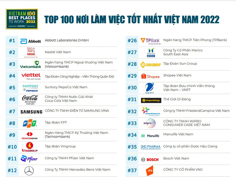 Cộng đồng nghề nghiệp Anphabe kết hợp với Công ty nghiên cứu thị trường Intage vừa công bố danh sách những nơi làm việc tốt nhất Việt Nam năm 2022. Đây cũng là mùa thứ 9 Anphabe công bố danh sách này.