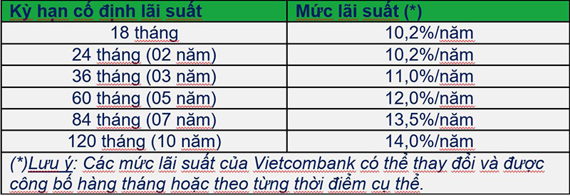 Để hỗ trợ nhu cầu tài chính của khách hàng, Vietcombank xây dựng các kỳ hạn cố định lãi suất đa dạng bao gồm: 18 tháng, 24 tháng; 36 tháng; 60 tháng; 84 tháng (07 năm) và lên tới 120 tháng (10 năm).