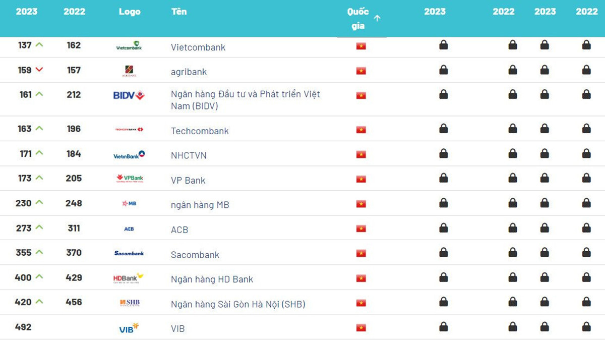 Như vậy, với 12 ngân hàng, Việt Nam đứng đầu khu vực ASEAN về số lượng nhà băng lọt Top 500. Tiếp theo là Indonesia và Philippines cùng có 9 ngân hàng, Malaysia (8 ngân hàng), Thái Lan (6 ngân hàng) và Singapore (3 ngân hàng). Bên cạnh đó, các ngân hàng Việt Nam cũng dẫn đầu ASEAN về tổng số hạng được thăng, cụ thể: 12 ngân hàng Việt Nam thăng được 296 hạng, tiếp theo là Indonesia thăng 79 hạng, Singapore thăng 20 hạng, trong khi Thái Lan tụt 25 hạng, Malaysia tụt 56 hạng, Philippines tụt 80 hạng.