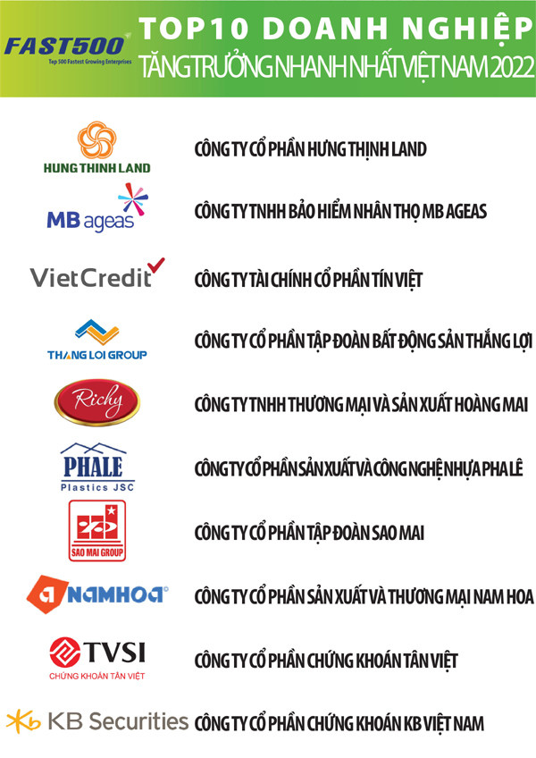 Bảng xếp hạng FAST500 được thực hiện bởi Vietnam Report, đã bước sang năm thứ 12 trên chặng đường tìm kiếm, ghi nhận và tôn vinh những thành tích xứng đáng của các doanh nghiệp (DN) đạt hiệu quả tốt trong kinh doanh, dựa trên tiêu chí chính là tốc độ tăng trưởng kép (CAGR) về doanh thu. Bên cạnh đó, các tiêu chí như tổng tài sản, vốn chủ sở hữu, lợi nhuận trước thuế và uy tín DN trên truyền thông… cũng được sử dụng như yếu tố bổ trợ để xác định quy mô cũng như vị thế của DN trong ngành hoạt động.